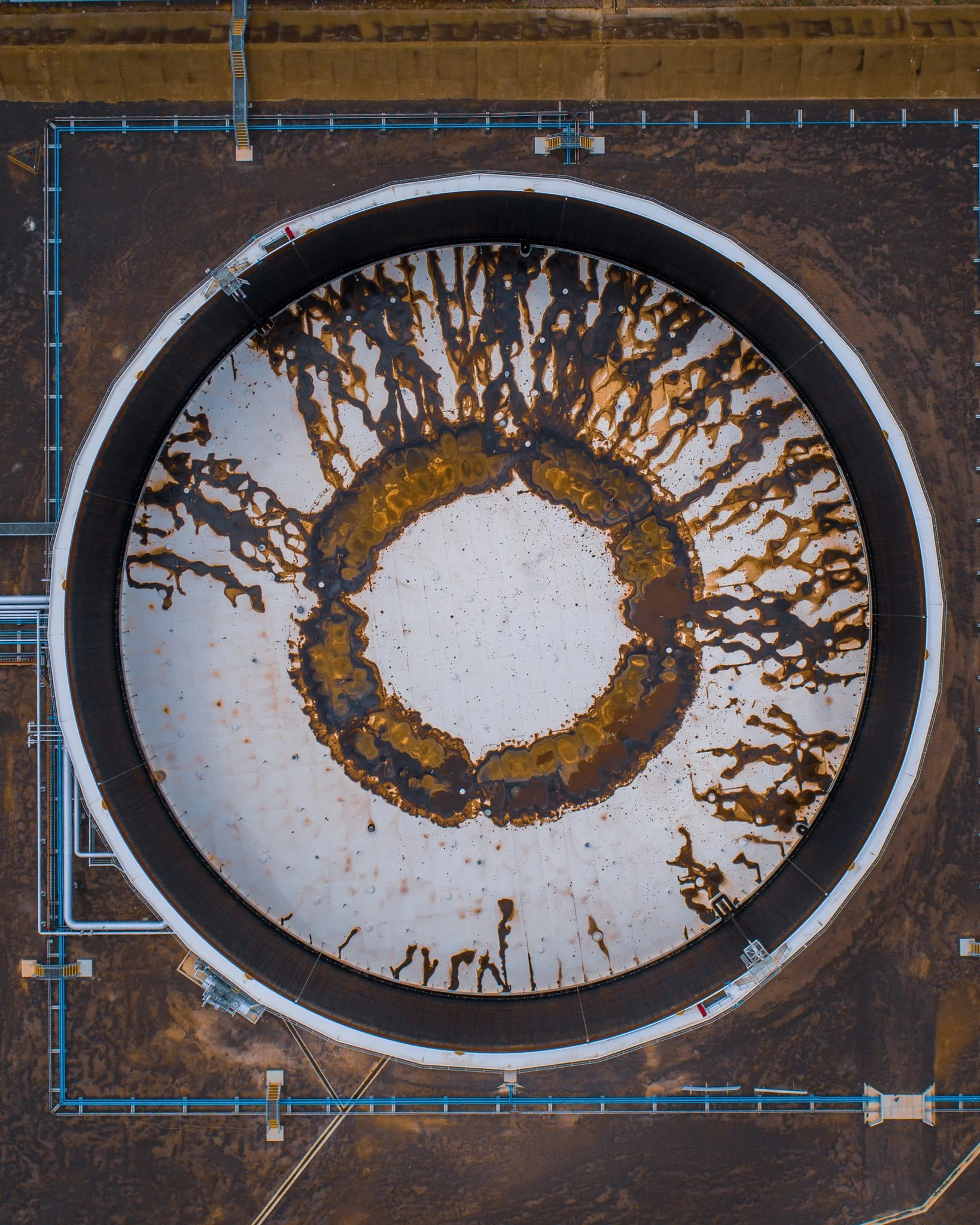 This storage tank stops being a piece of infrastructure and starts to feel like an eye. The white surface is etched with rings and streaks of rust that read like an iris and lashes, radiating out in irregular bursts. Around it, pipes and walkways draw a measured square frame, trying to contain all that organic disorder. It is a view of industry at its most abstract, where corrosion, paint and geometry come together as a kind of accidental drawing on the land.
